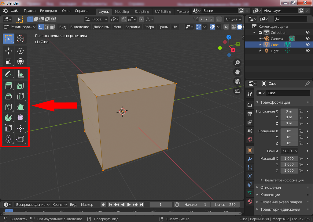 В этом режиме доступны как стандартные инструменты, так и специализированные для моделирования мешей.