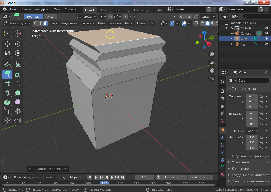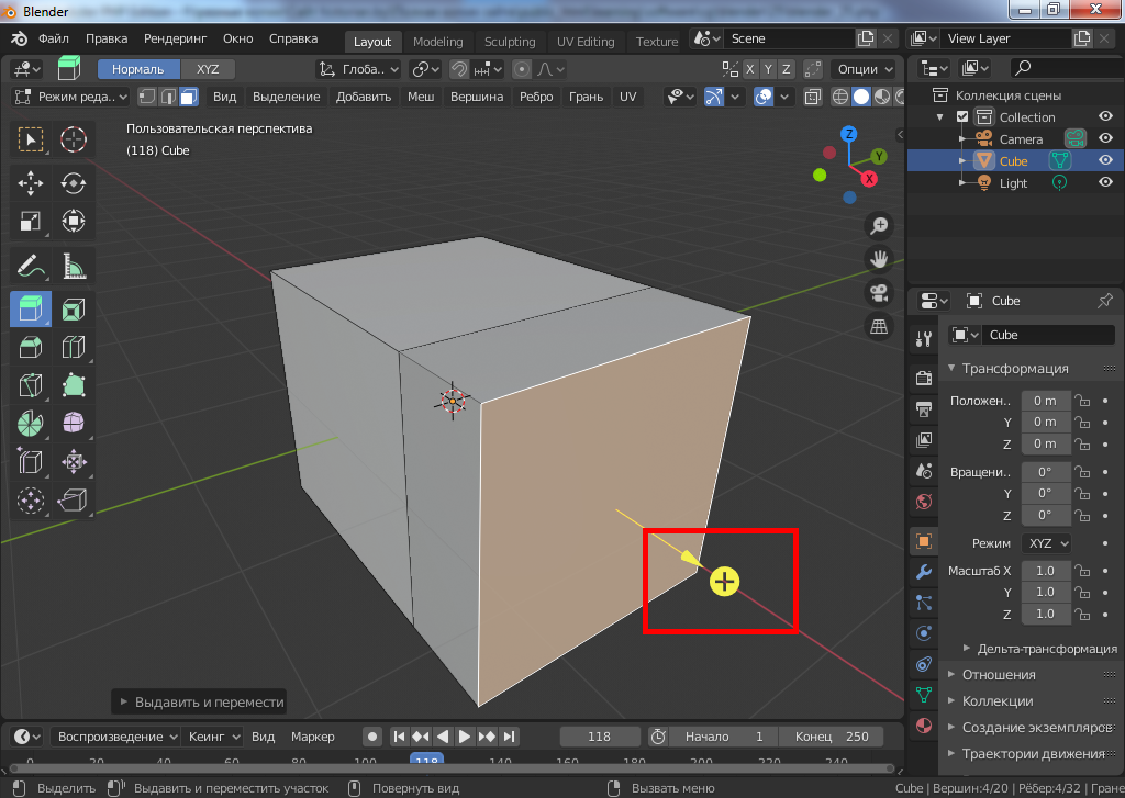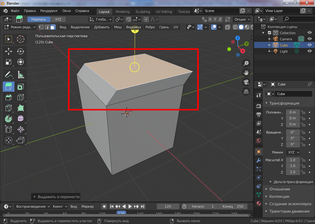 Инструмент экструдирования участка (extrude region) применяется только к рёбрам (edges) и граням (faces). На снимке ниже выбрана верхняя грань куба. Для её перемещения в произвольном направлении используйте нажатую левую клавишу мышки, при этом курсор может находиться в любом месте в пределах окна просмотра (viewport).