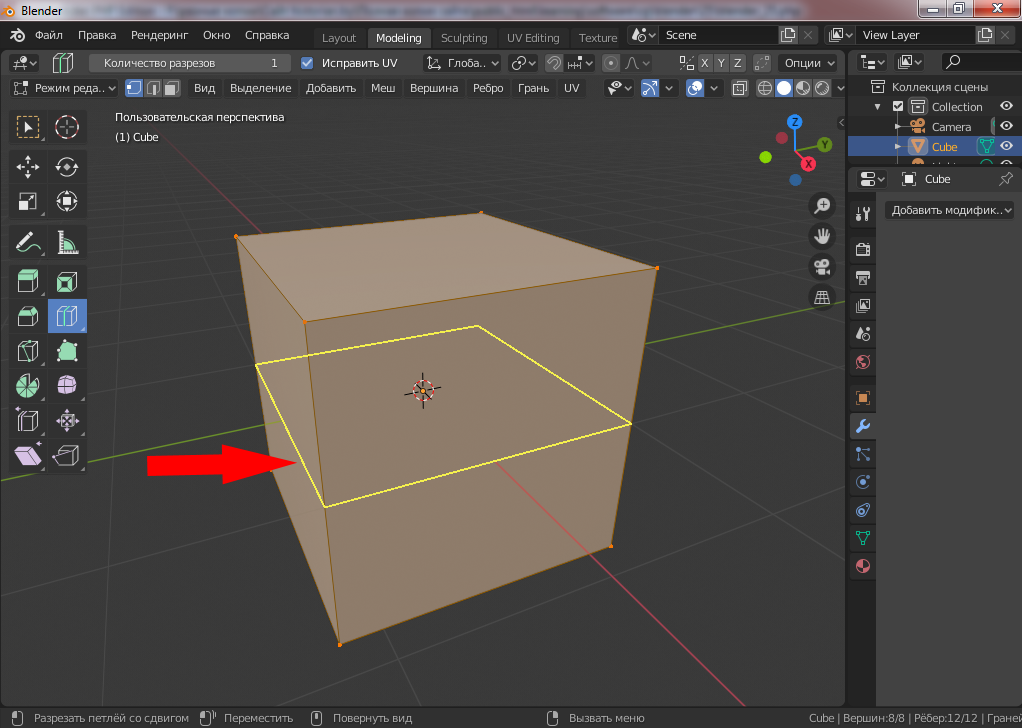 Разрезание петлёй (loop cut) делит грань и соответствующие рёбра строго пополам. При подведении курсора к любому ребру автоматически появятся жёлтые линии, обозначающие места разрезания.