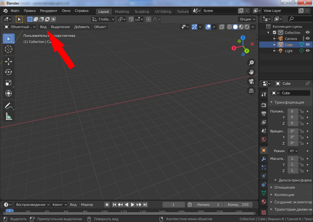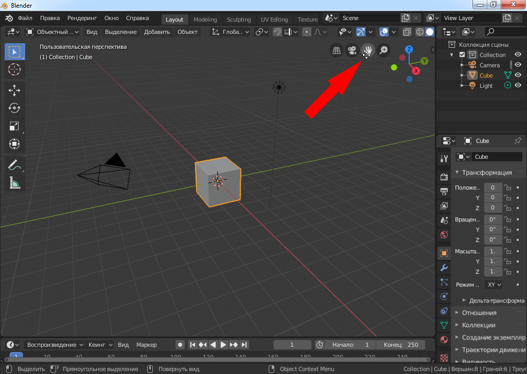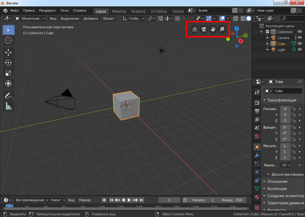 Окно просмотра (viewport) это область интерфейса Blender, в котором отображаются объекты сцены. На кадре ниже представлены три объекта: куб, камера и свет. Для выбора объекта щёлкните по нему левой клавишей мышки.