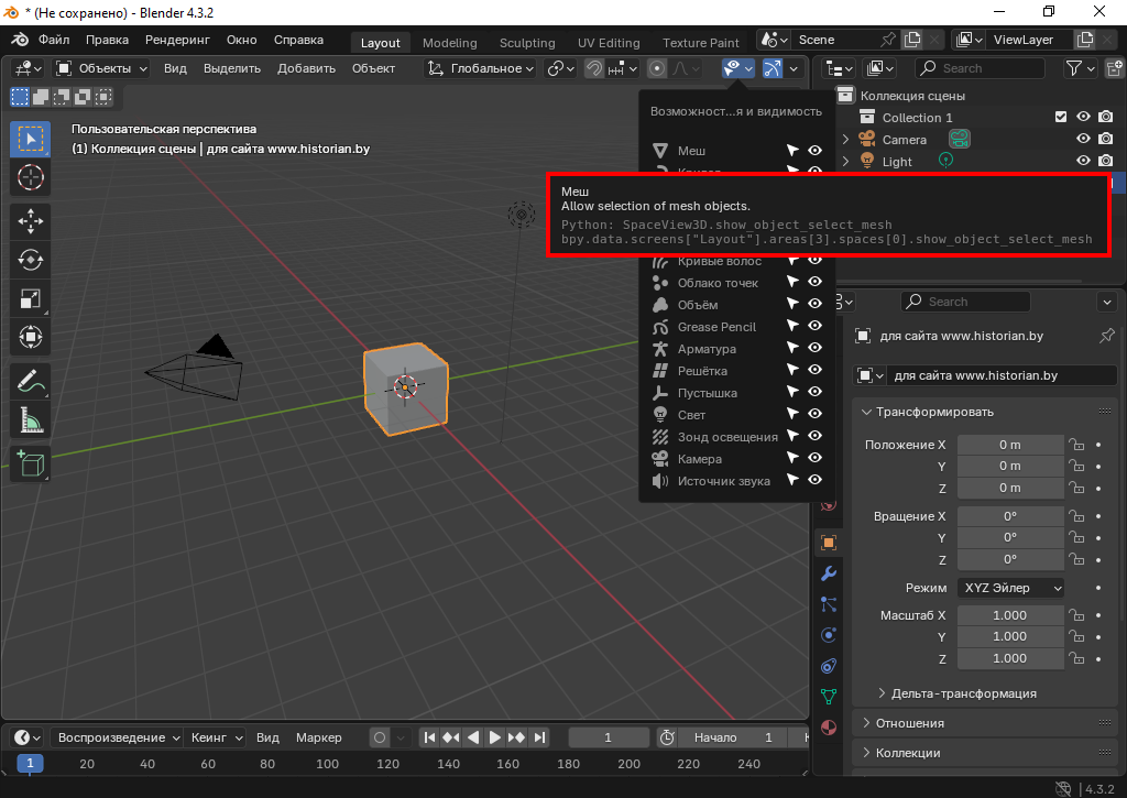 Например, для передвижения объекта (в данном случае куба) наберите следующий код: