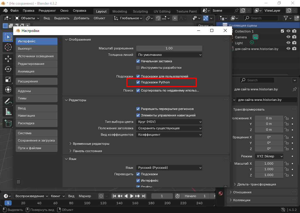 В Blender есть встроенный интерпретатор Python. С помощью скриптов Python можно автоматизировать работу с интерфейсом Blender, создавать геометрические объекты, делать рендеринг и т.д. Для облегчения работы рекомендуется в параметрах интерфейса Blender включить подсказки Python.