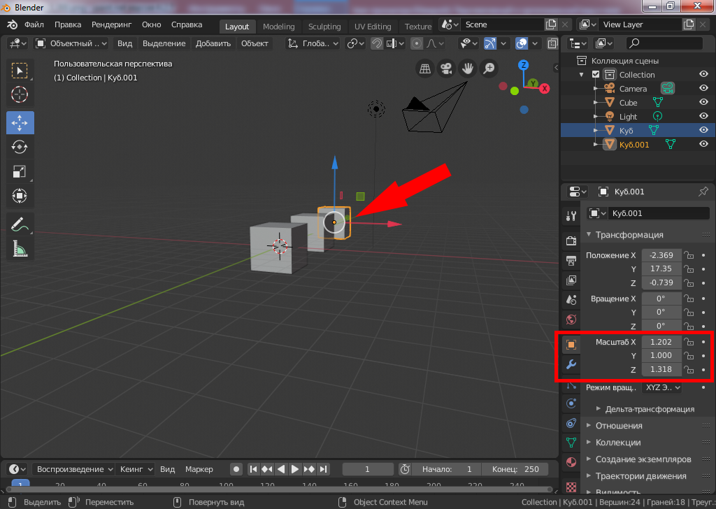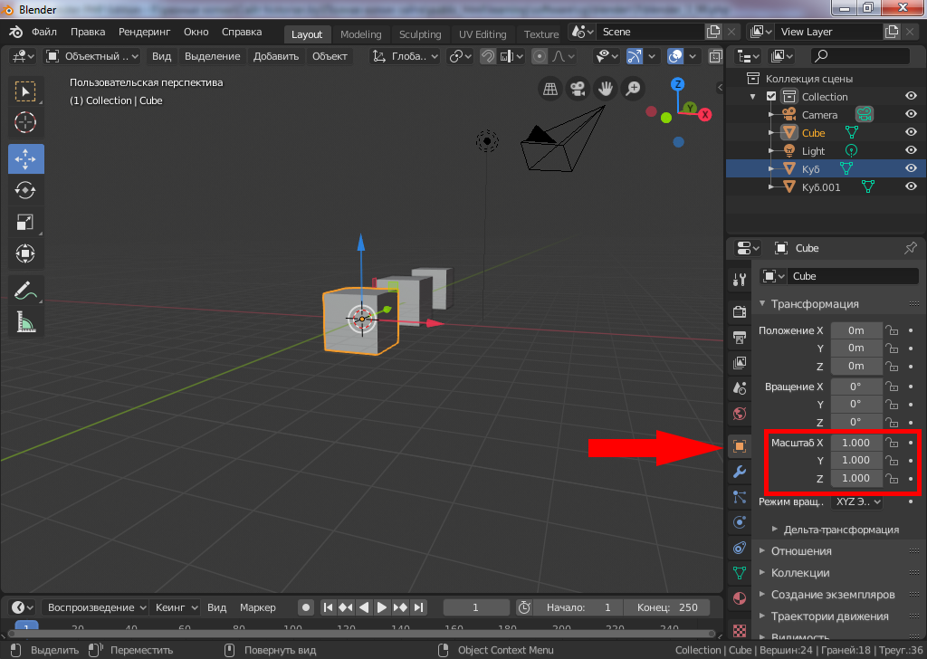Один из трёх кубов отличается по размерам. Давайте проверим их размеры. Для этого выберите в окне просмотра (Viewport) ближний куб. Далее выберите вкладку "Контекст объект" и параметр "Масштаб" для осей x, y, z. Если везде указана цифра 1, значит размеры объекта не менялись от исходных.