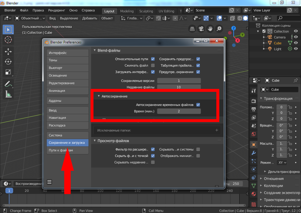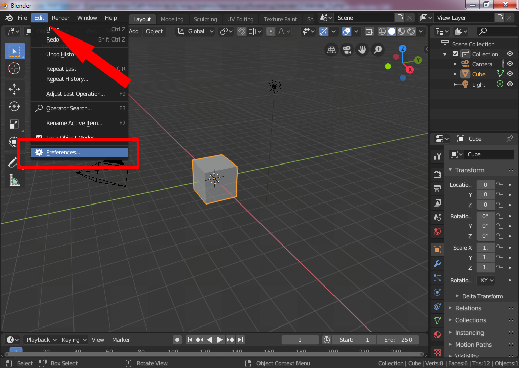 Для того, чтобы открыть настройки Blender, выберите в меню "Edit"->"Preferences".