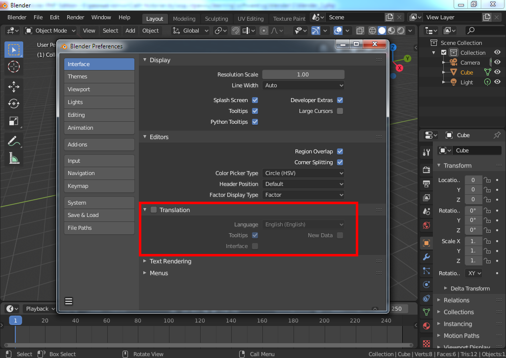 Для того, чтобы языковые настройки вступили в силу, напротив параметра "Translation" должна стоять галочка. В дальнейших пояснениях будет использоваться перевод интерфейса Blender на русский и английский языки.