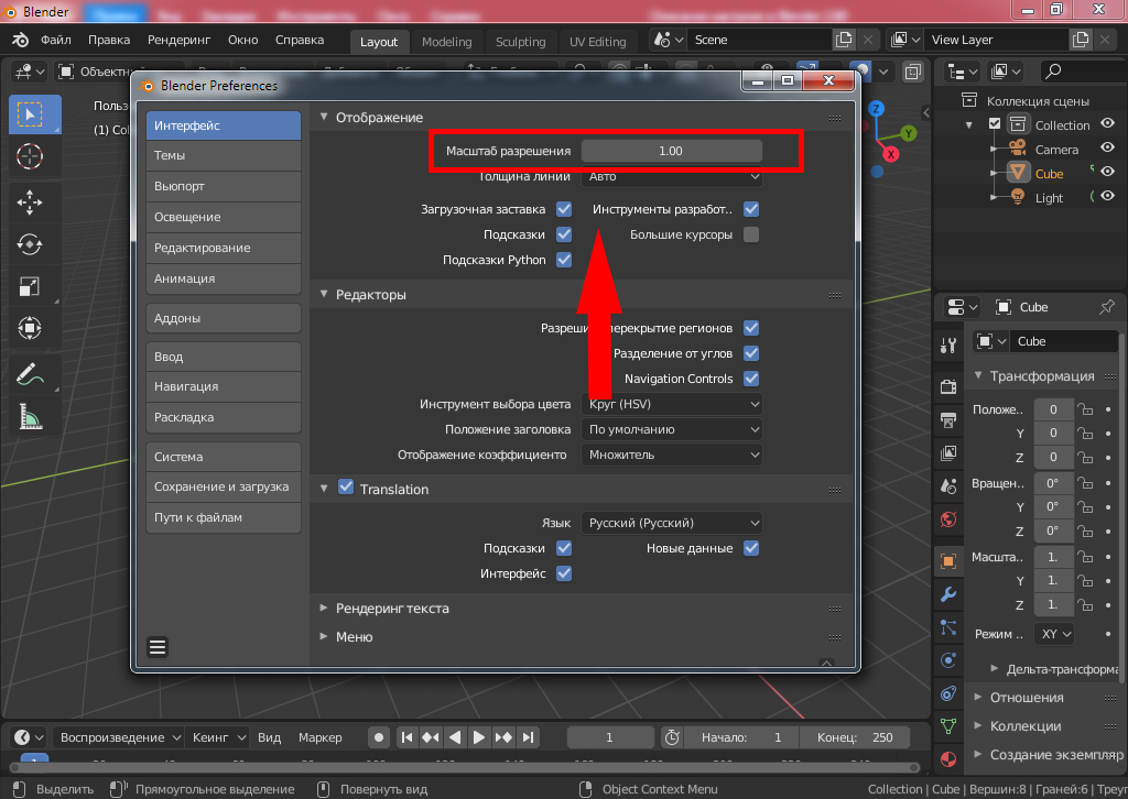 Опция "Масштаб разрешения" вкладки "Интерфейс" позволяет настраивать размеры элементов интерфейса Blender. Параметр "1.00" соответствует изначальному. Параметр меньше "1.00" уменьшает все элементы интерфейса (пиктограммы, текст, размеры меню и т.д.), параметр больше "1.00" увеличивает размеры всех элементов. Обратите внимание, что выбранный параметр действует и после перезагрузки Blender.
