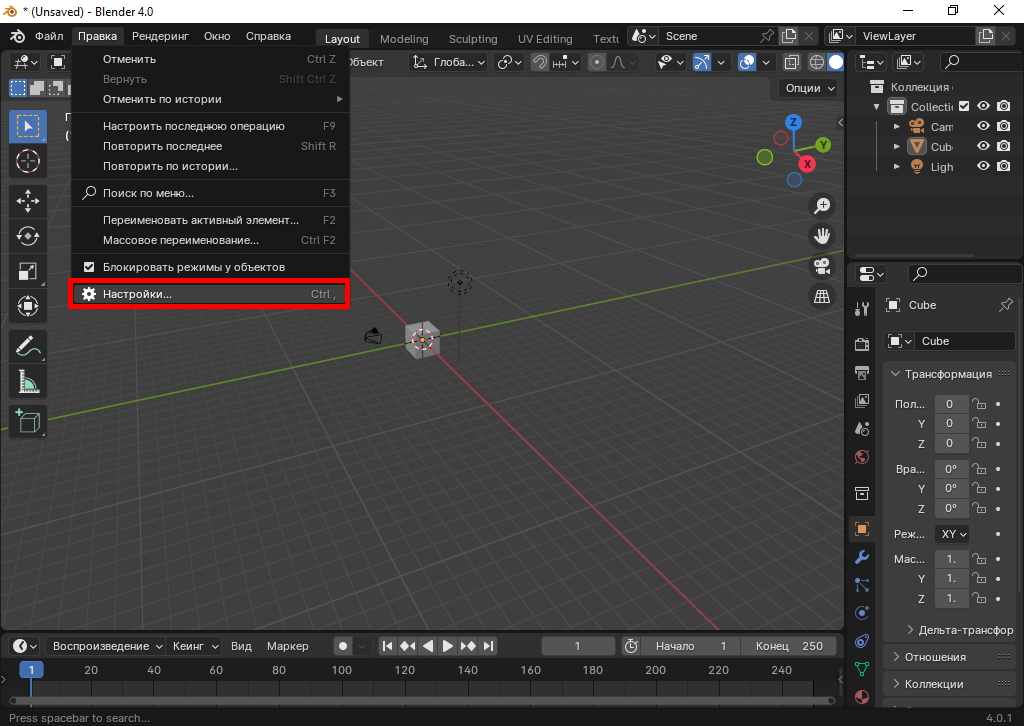Изменить сочетание клавиш можно для следующих функций Blender 4.0 (некоторые указаны в английском написании, т.к. перевод интерфейса программы на русский ещё не завершён):