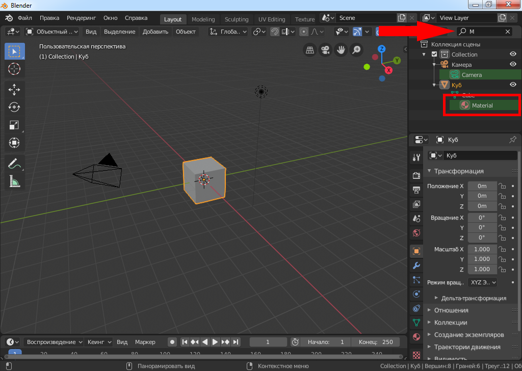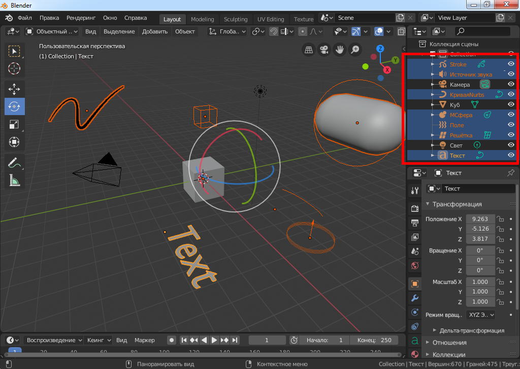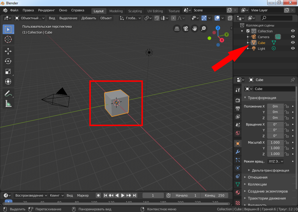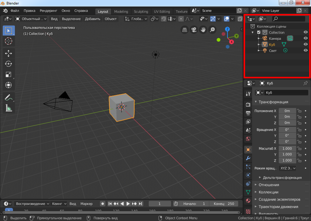 В окне "Структура проекта" (Outliner) показаны все объекты сцены. Иконка выбранного в данный момент объекта выделяется серым квадратом.