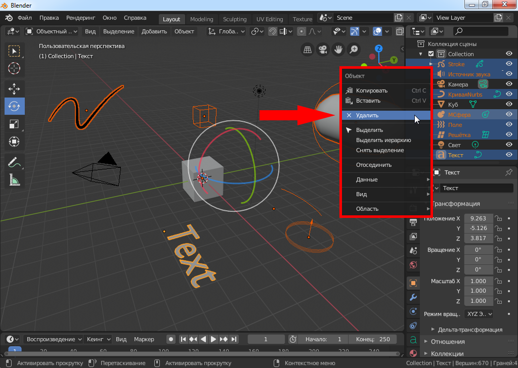 Клавиша Delete не удаляет объекты из "Структуры проекта" (Outliner), вместо этого используйте контекстное меню.