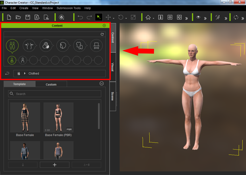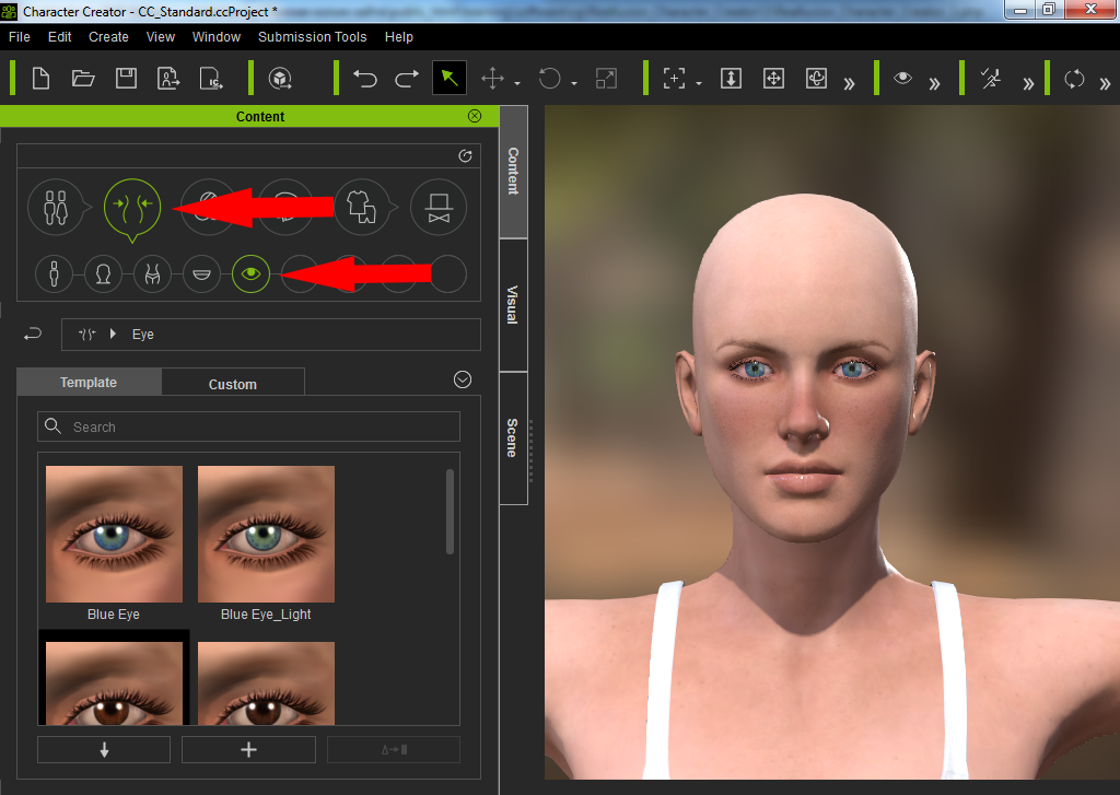На панели "Content" вы можете отрегулировать причёску, форму головы и другие параметры.
