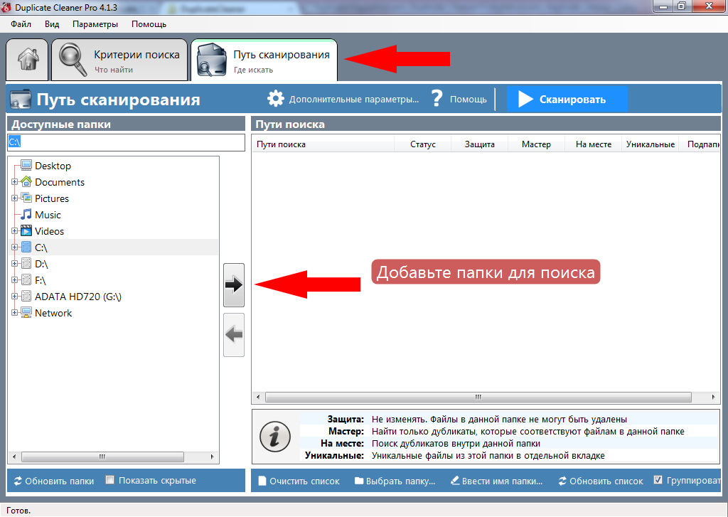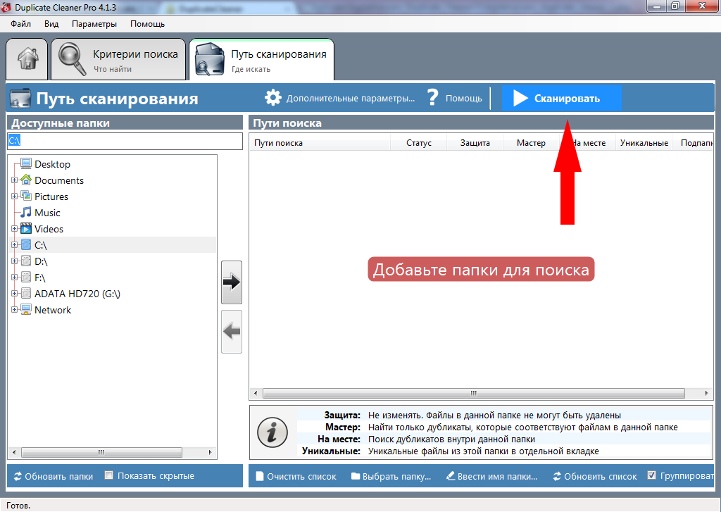 На вкладке "Путь сканирования" добавьте папки, где будет осуществляться поиск дубликатов.