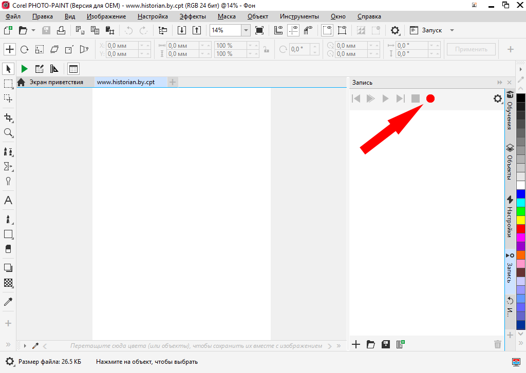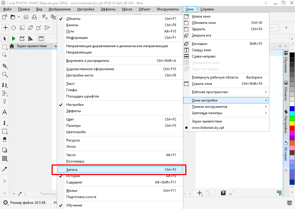 Для записи действий в Corel PHOTO-PAINT 2025 26.0 для последующего воспроизведения или редактирования необходимо через меню "Окно"->"Окна настройки"->"Запись" открыть настройки записи. Сделать это можно также с помощью сочетания клавиш Ctrl+F3.