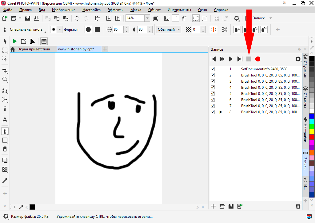 Для записи нажмите на кнопку с красным кружком. Создайте рисунок, который вы хотите сохранить в качестве макроса для дальнейшей автоматизации.