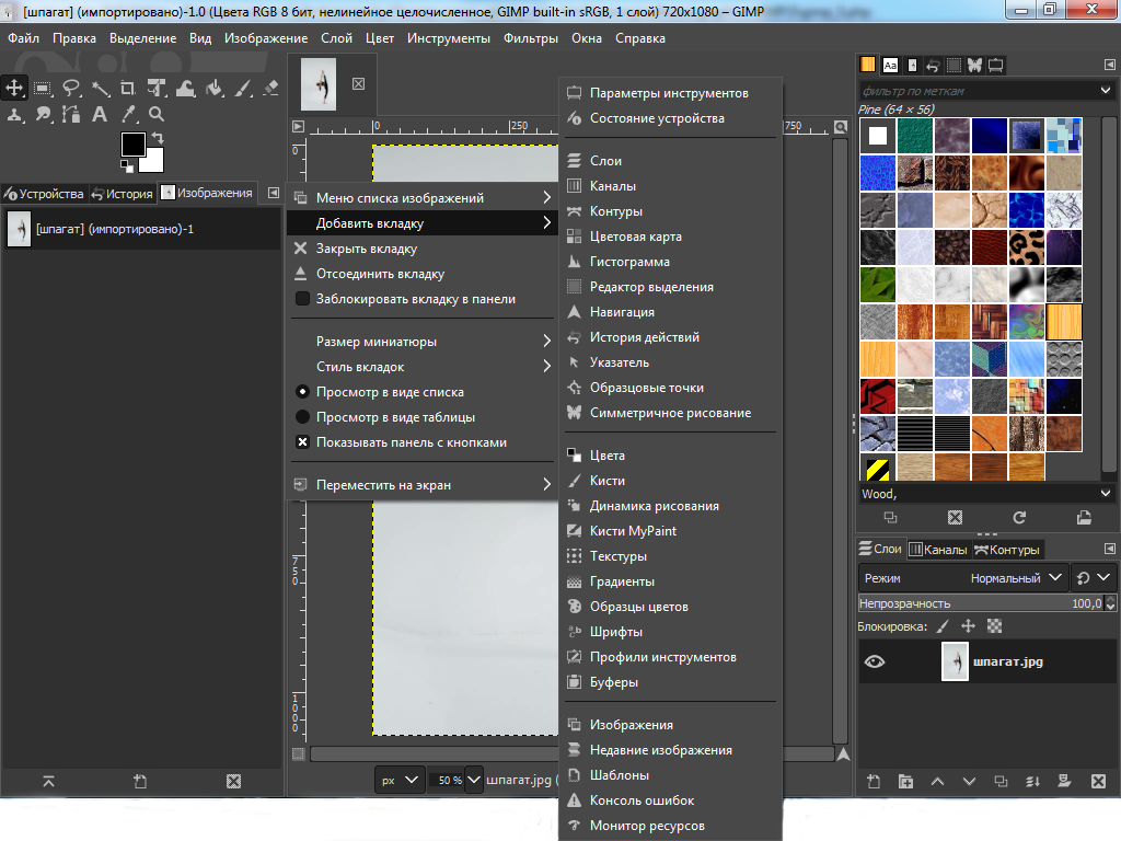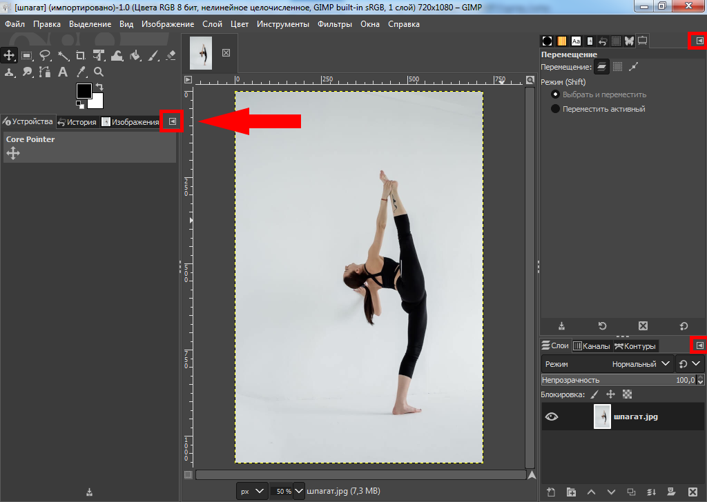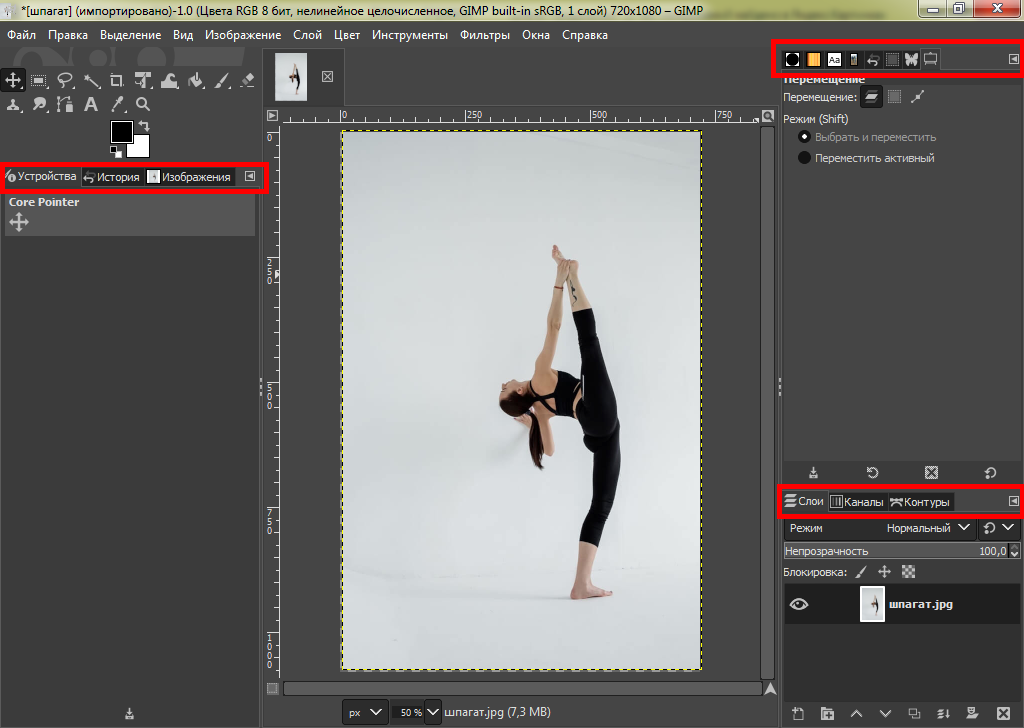 GIMP позволяет свободно перемещать вкладки с окнами (на снимке ниже выделены красным) в пределах своего интерфейса. При нехватке места текстовые пояснения вкладок будут заменены на пиктограммы.