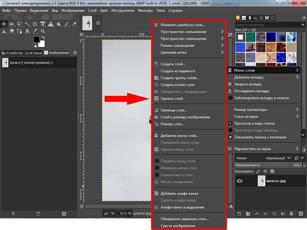 Обратите внимание, что у разных вкладок отличается первый пункт меню. Например, так выглядит меню слоёв.
