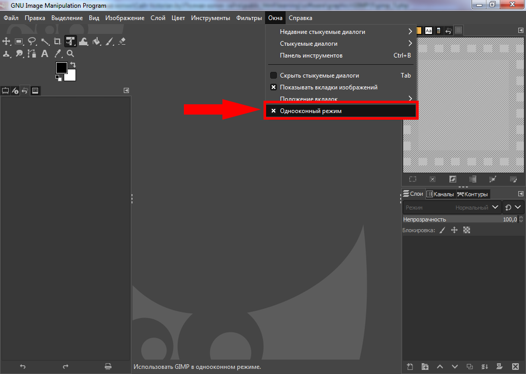 GIMP может работать в однооконном и многооконном режимах. Переключается через меню "Окна" -> "Однооконный режим".