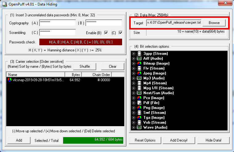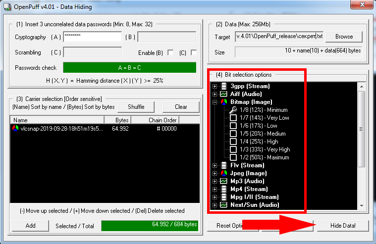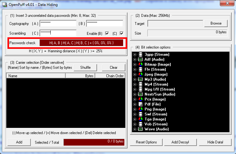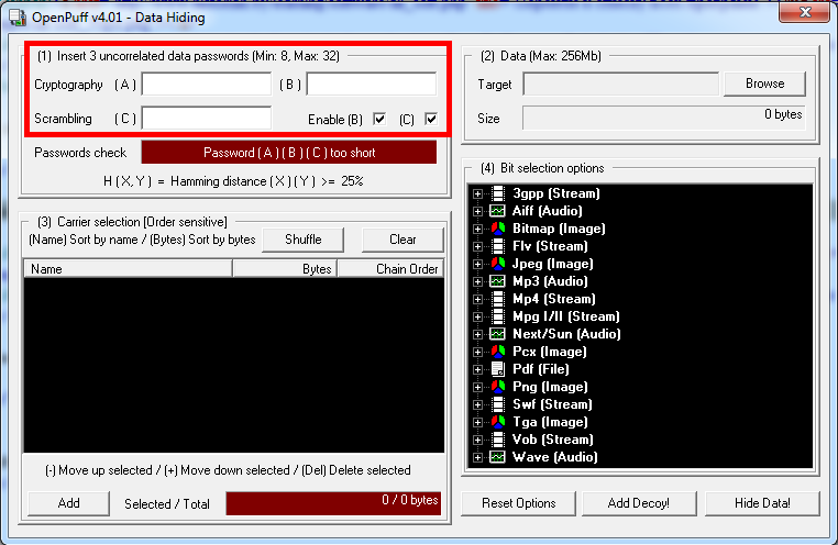 OpenPuff позволяет использовать сразу три пароля, воспользуемся такой возможностью. Минимальная длина - 8 символов, макисмальная - 32 символа.