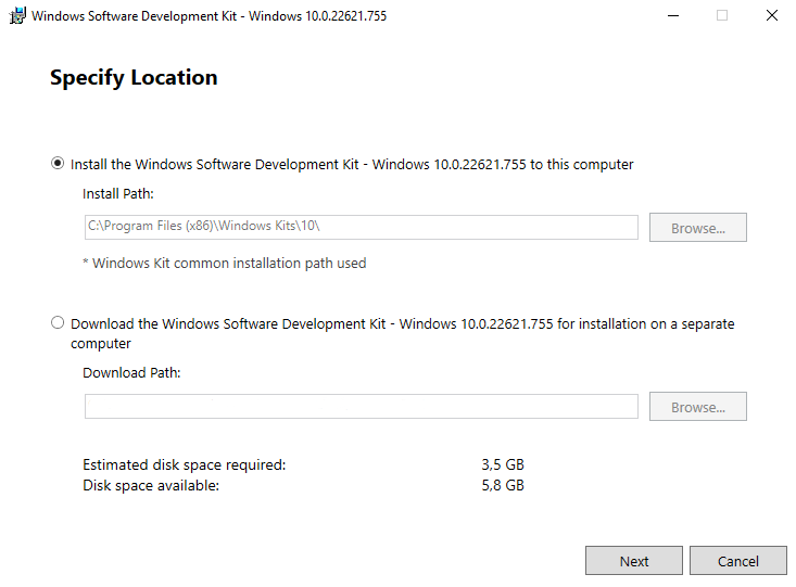 После скачивания файла необходимо распаковать файл с расширением .iso. Я воспользовался архиватором 7-Zip. После распаковки получатся две папки и файл-установщик WinSDKSetup.exe. После запуска будет предложено выбрать место для установки. Я оставил по умолчанию.