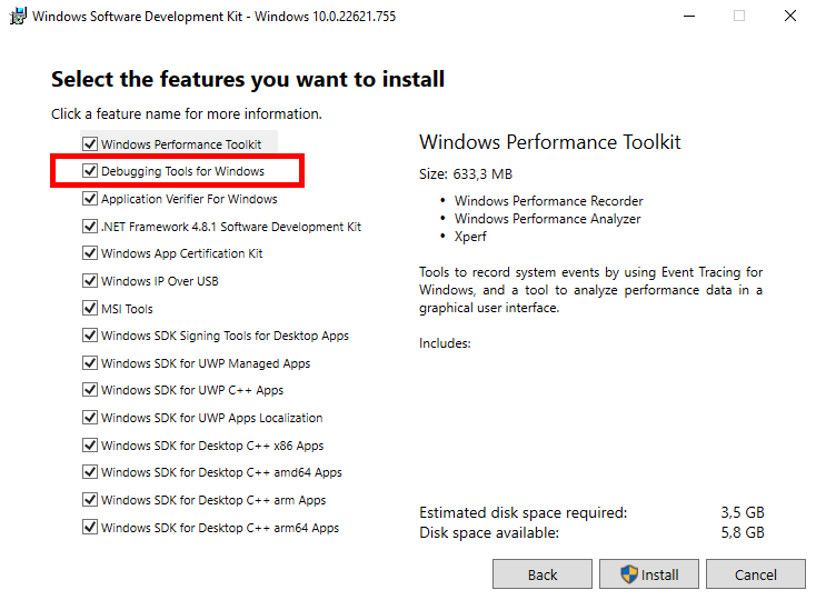 Поставьте галочку напротив строчки "Debugging Tools for Windows". Нажмите "Изменить" или "Change". Начнётся установка избранных программ.