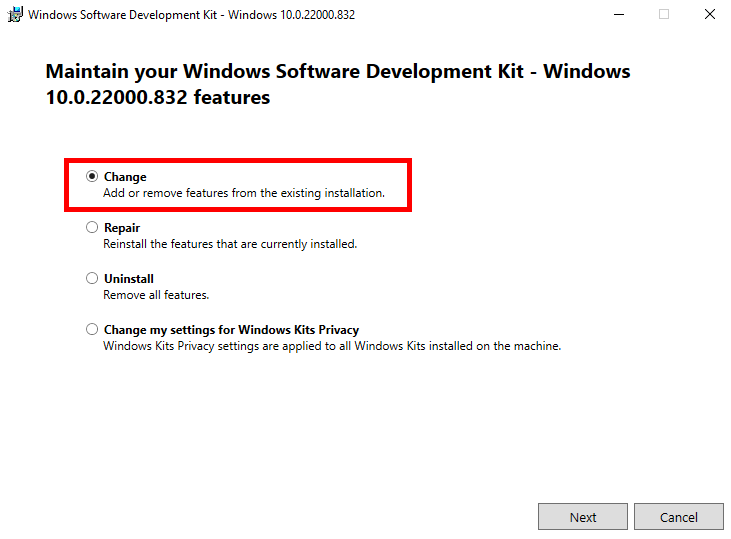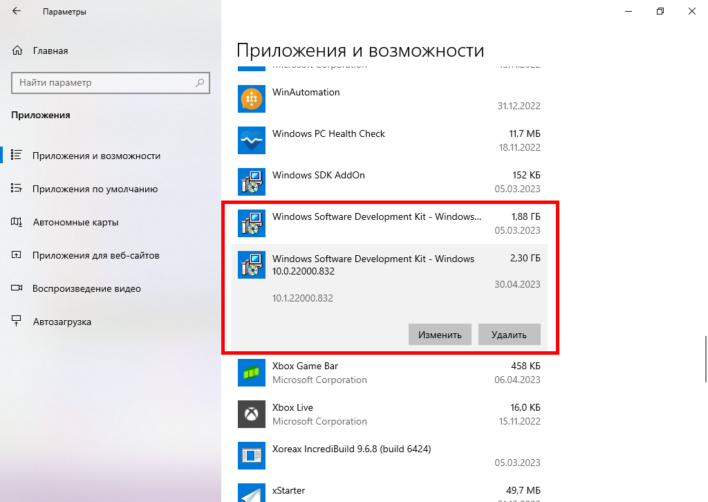 Способ 1. Найти в списке установленных программ Windows Software Development Kit. У меня нашлись две версии. Одна - 10.0.20348.1, вторая - 10.0.22000.832. Выберите более свежую версию и нажмите "Изменить".