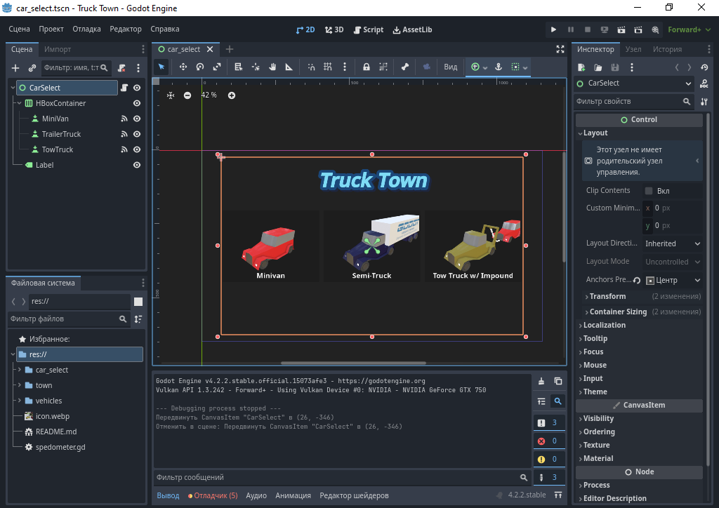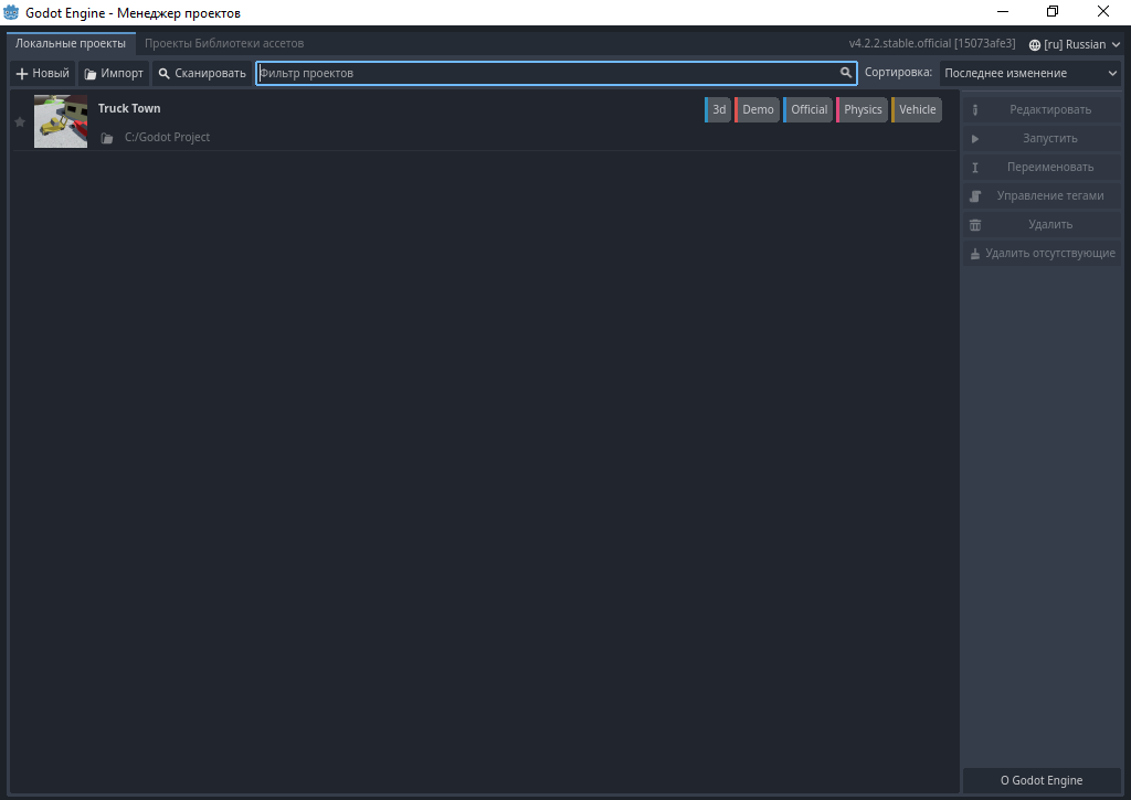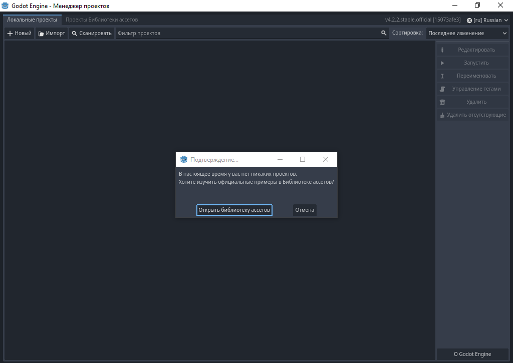 Так выглядит интерфейс Godot сразу после запуска. Если вы не желаете просматривать примеры проектов, тогда нажмите "Отмена". В данном случае посмотрим на примеры проектов, нажав на кнопку "Открыть библиотеку ассетов". Для просмотра и загрузки примеров проектов у Godot должен быть доступ к интернету.