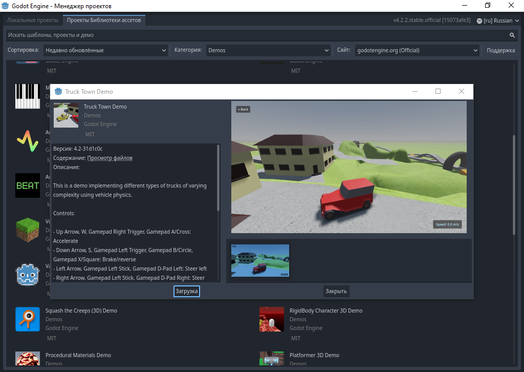 Для предварительного просмотра примера проекта щёлкните по его названию. Для открытия проекта нажмите на кнопку "Загрузка".