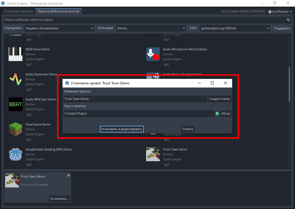 При необходимости выберите папку для размещения проекта. Далее нажмите кнопку "Установить и редактировать".