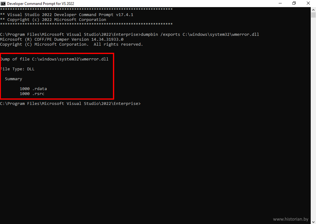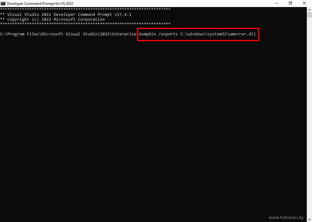 В открывшемся окошке командной строки наберите команду dumpbin с параметром /exports. Далее необходимо указать файл динамической библиотеки, для которого вы хотите просмотреть экспортируемые функции. В моём примере это файл wmerror.dll из системной папки C:\Windows\System32\
