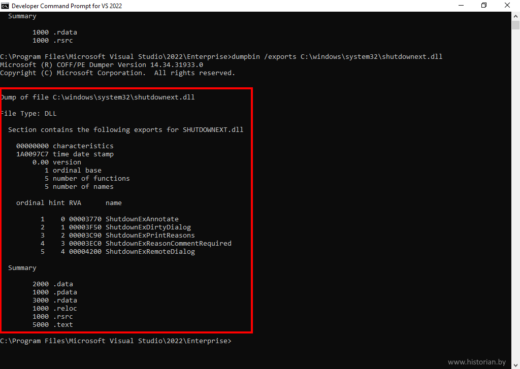 Просмотр экспортируемых функций динамических библиотек dll с помощью dumpbin среды разработки Microsoft Visual Stuio 2022 17.4