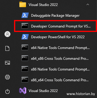 Откройте из меню "Пуск" из папки Visual Studio 2022 инструмент Developer Command Prompt VS 2022.
