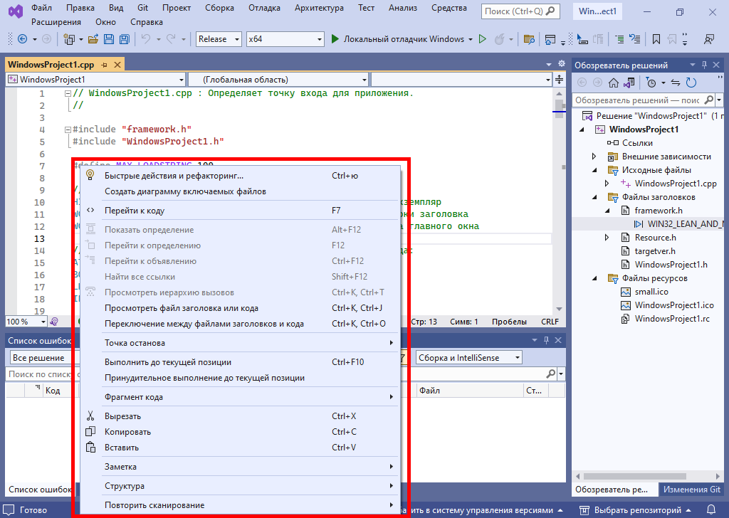 Урок №1. Работа с контекстным меню в Microsoft Visual Studio Enterprise 2022 17.4