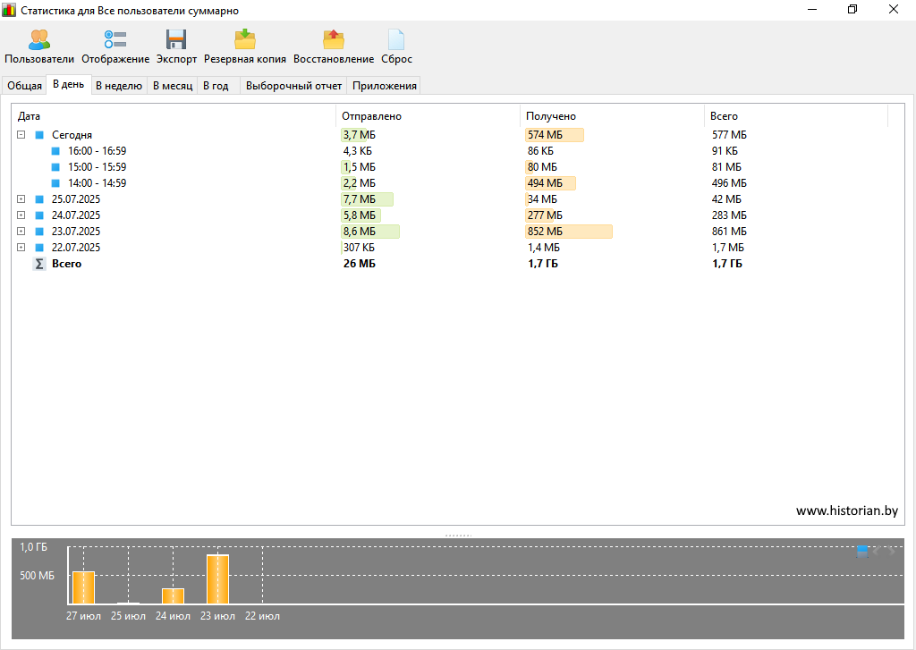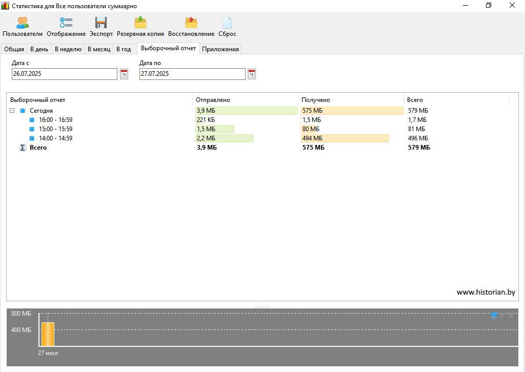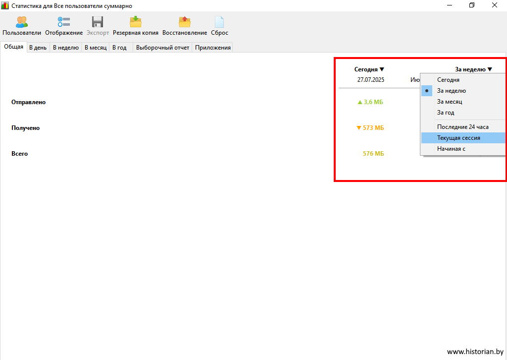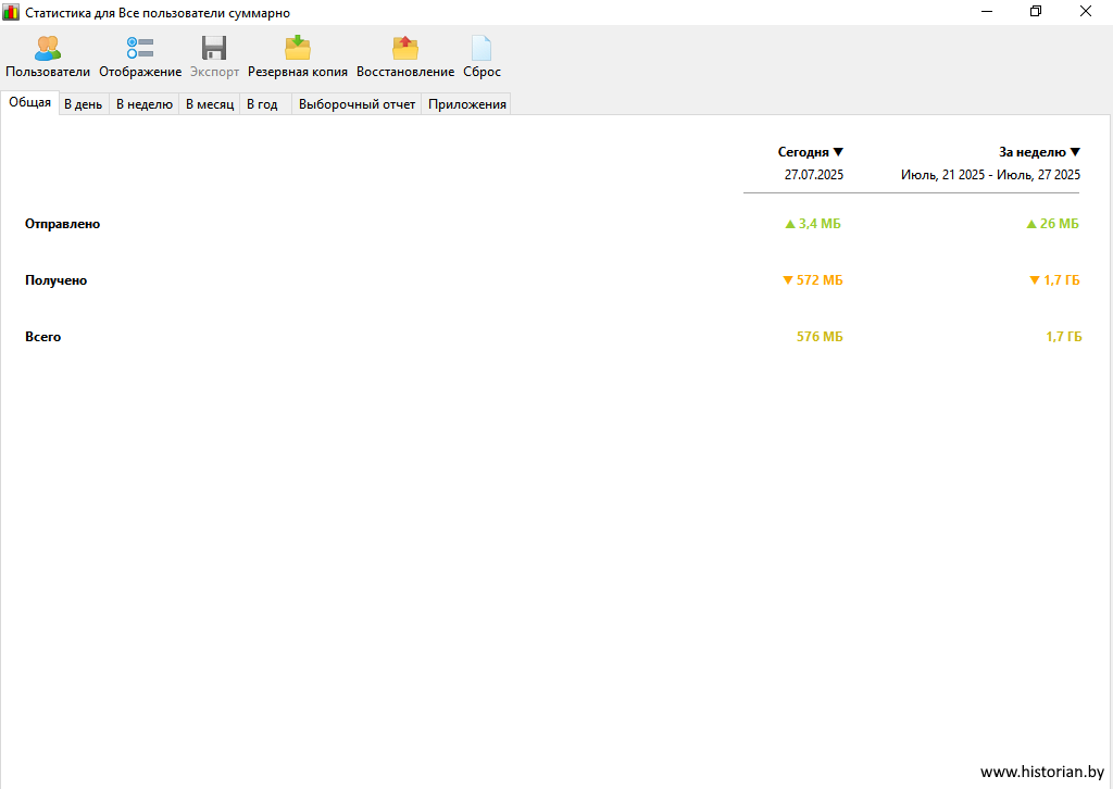 По умолчанию отображается сводная статистика для всех пользователей (можно просмотреть отдельно для каждого пользвателя). Показывается отправленный, полученный и общий трафик.