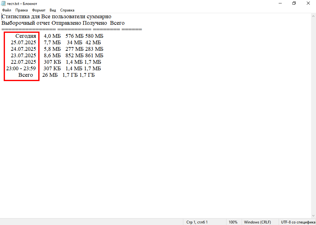 При этом стоит учесть, что в текстовый файл сохраняется только та информация, которая показана на экране. Если вы не раскрыли в отчёте просмотр по часам, информация о трафике по часам будет недоступна.