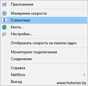 Программа SoftPerfect NetWorx показывает подробную статистику о трафике локального компьютера. Для доступа к этой функции щёлкните правой клавишей мышки по иконке программы в системном трэе, далее выберите пункт "Статистика".