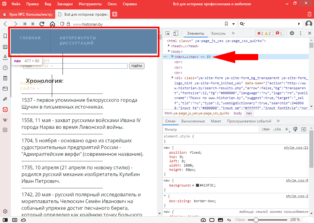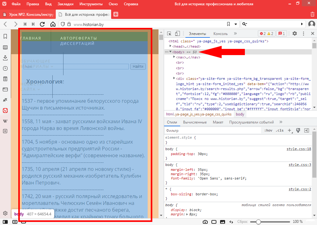 В прошлом уроке мы бегло познакомились с инструментами разработчика в браузере Vivaldi 5.3. В этом уроке посмотрим на возможности этих инструментов для отладки веб-страницы. Откроем страницу www.historian.by, запустим инструменты разработчика и наведём курсор на тег body. Что произошло дальше? Браузер подсветил область использования тега body (выделил красным цветом).
