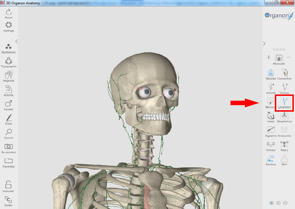 Для отображения лимфатической системы выберите на панели справа пункт "Lymphatic".