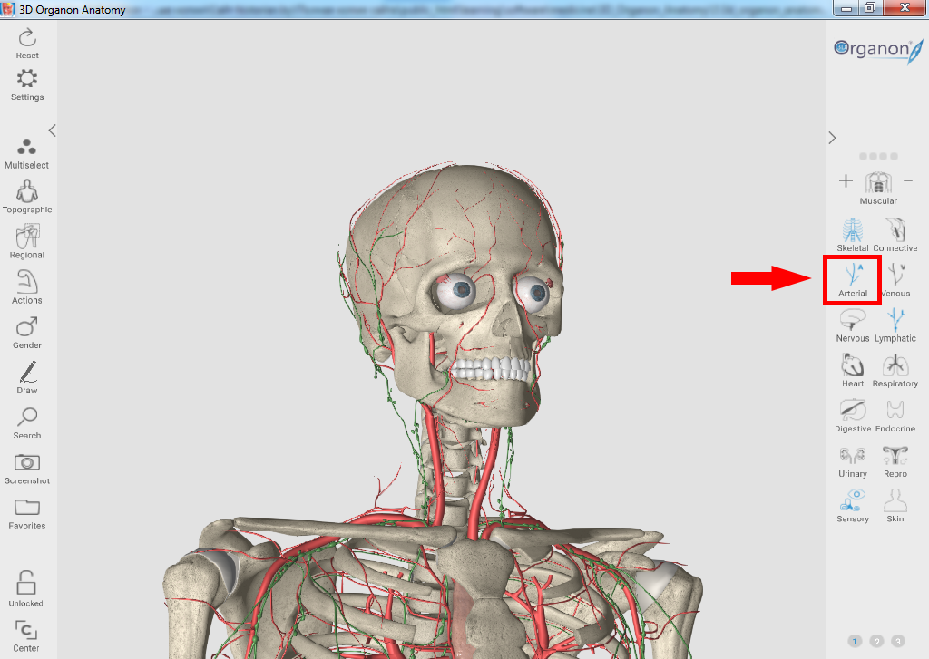 Для отображения артериальной системы выберите на панели справа пункт "Arterial".