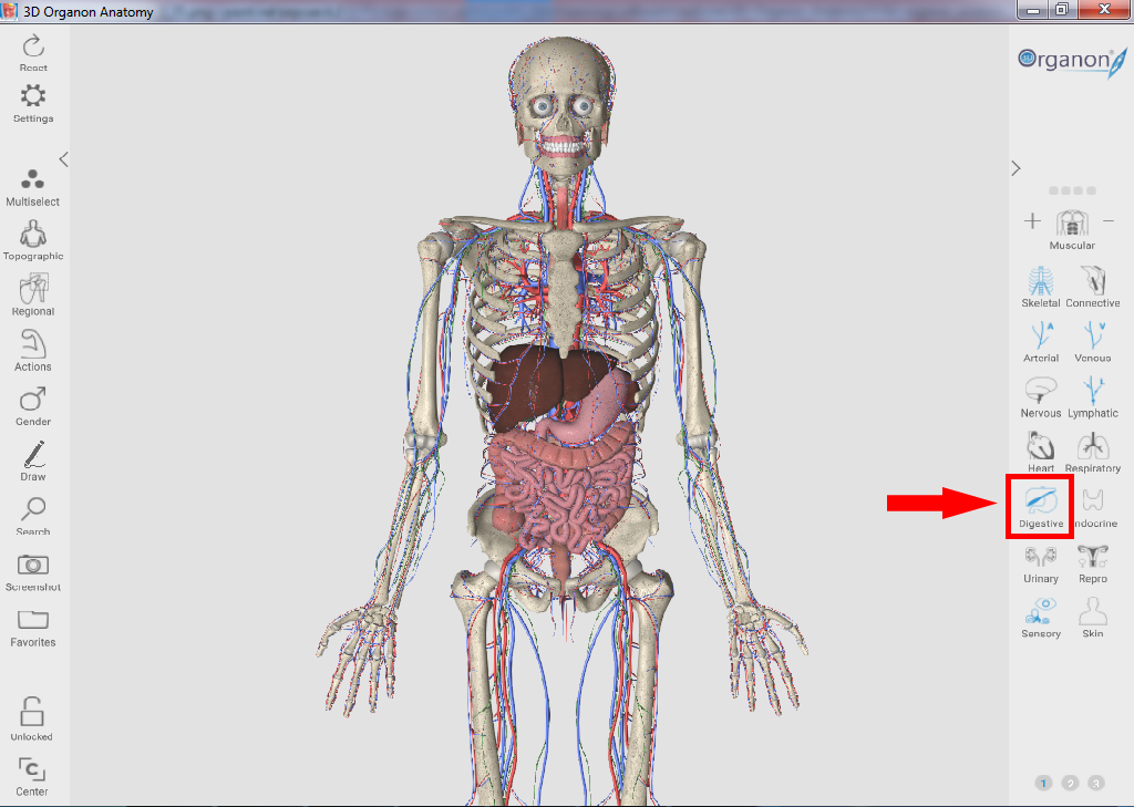 Для отображения пищеварительной системы выберите на панели справа пункт "Digestive".