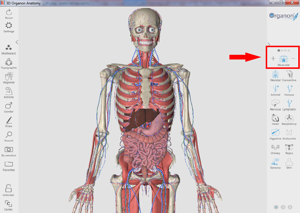 Для отображения мышечной системы выберите на панели справа пункт "Muscular", нажав на +. Каждое последующее нажатие на + увеличивает полноту отображения мышечной системы.