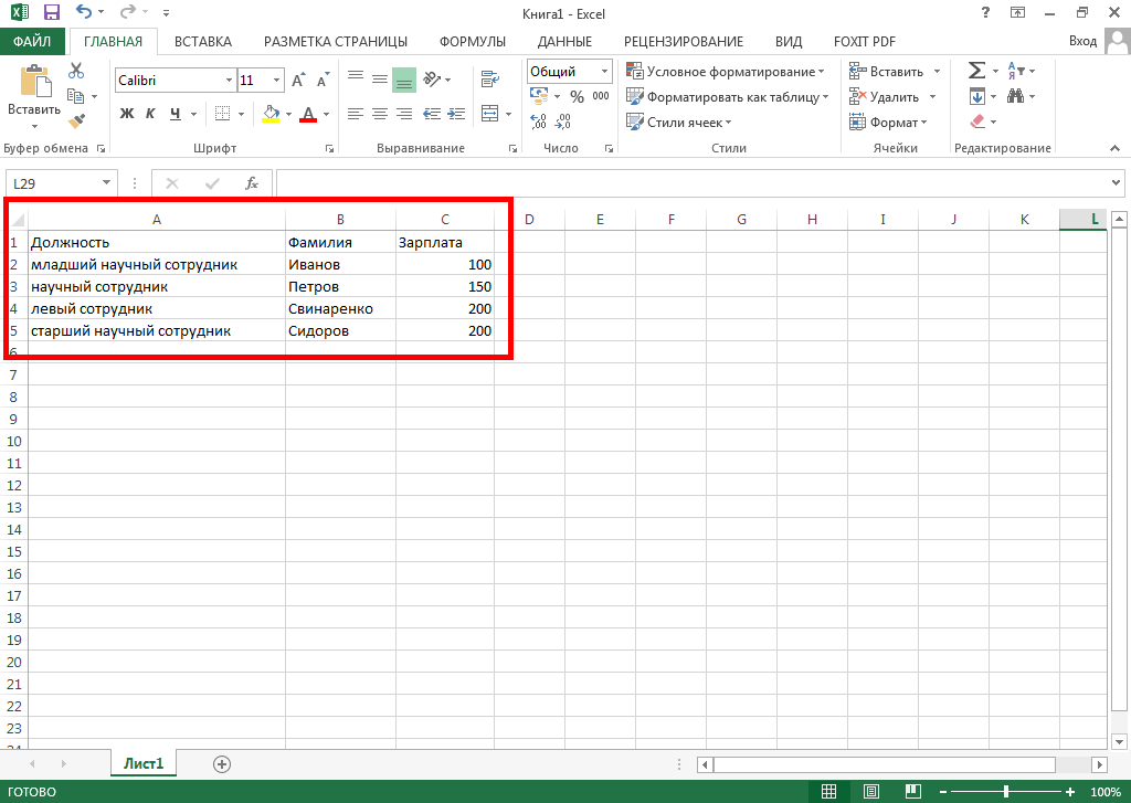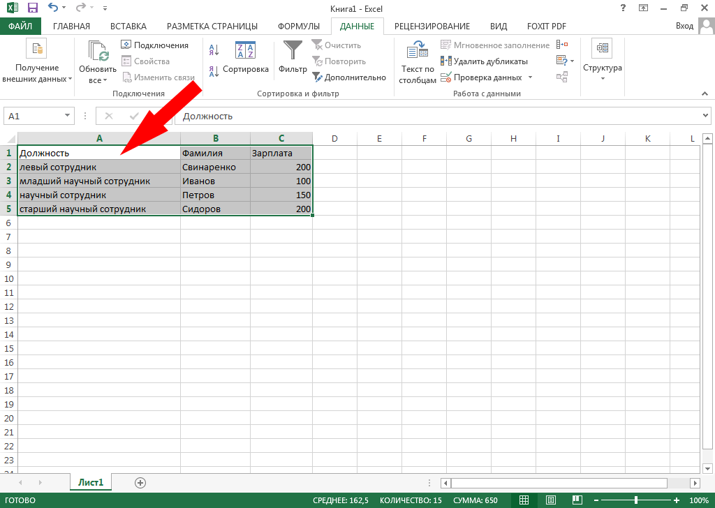 Создайте лист Excel из нескольких столбцов и строчек с текстом и числами.