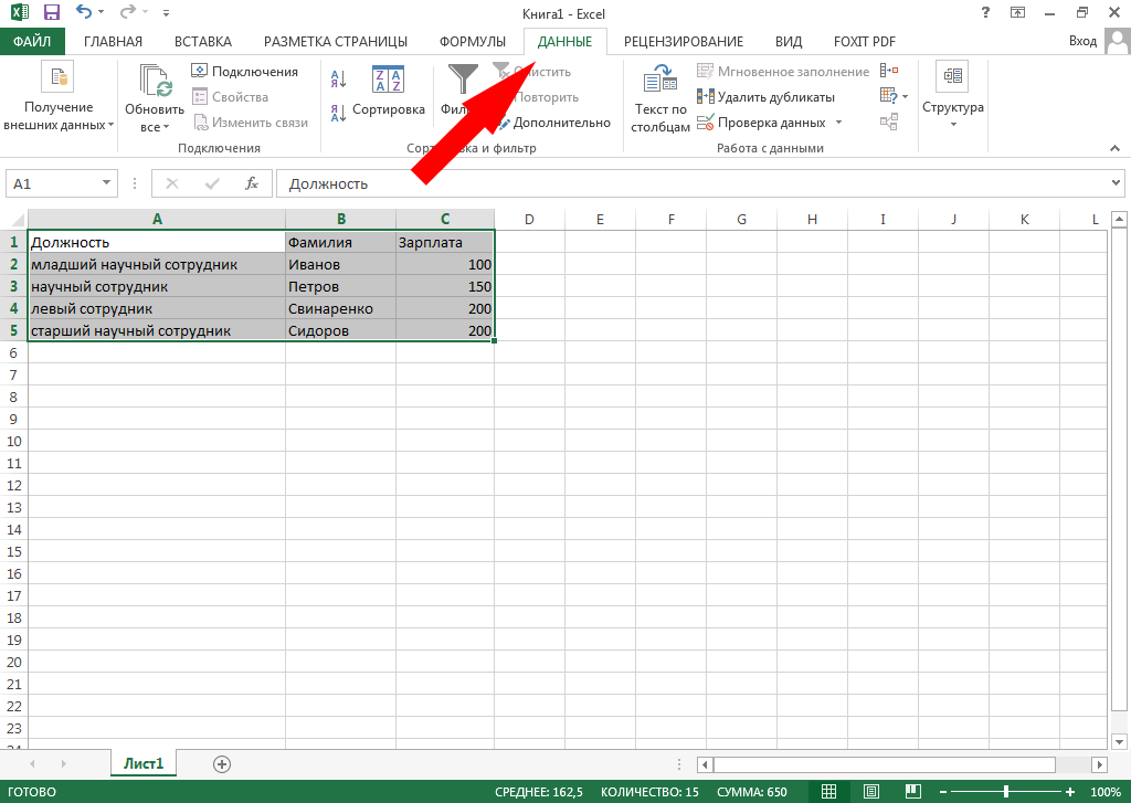 Перейдите на вкладку "Данные". Выделите все ячейки (Shift + левая клавиша мышки) для сортировки.