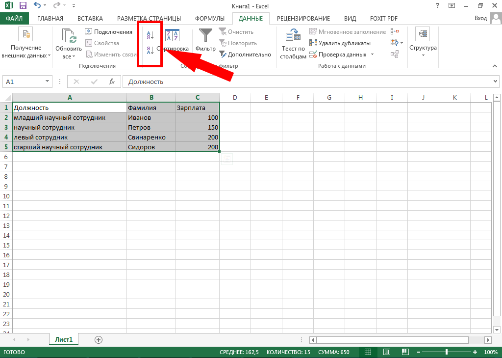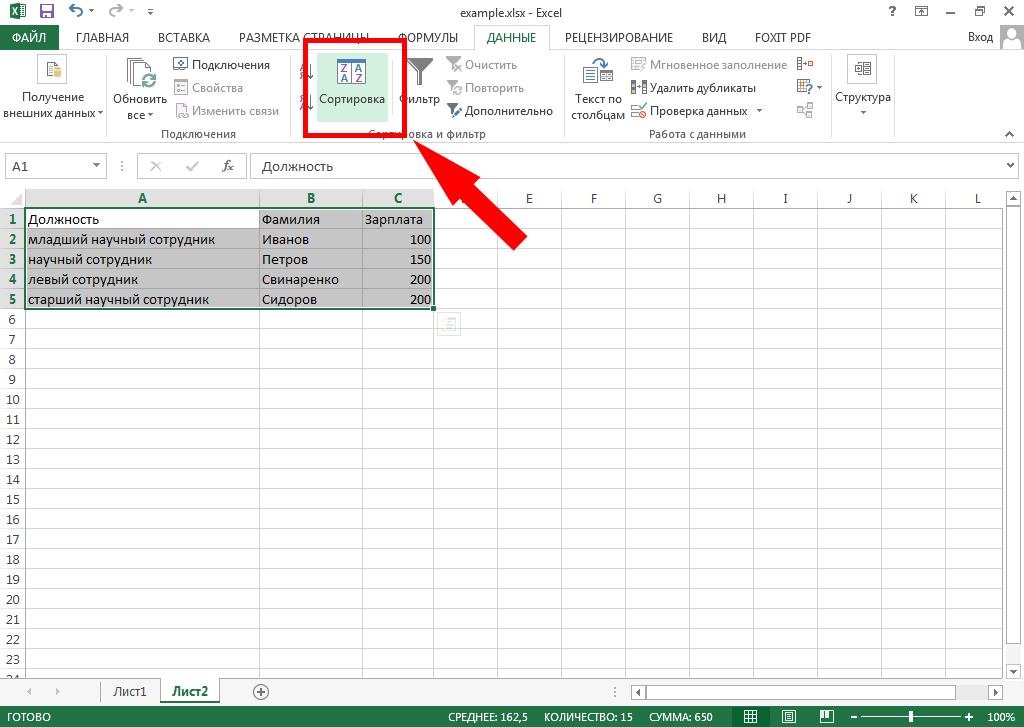 Без дополнительных параметров сортировка производится по столбцу ячейки, которая была выбрана первой (в данном примере это столбец А с белым фоном ячейки А1). Ячейки A1:C1 являются заголовками, поэтому не сортируются.