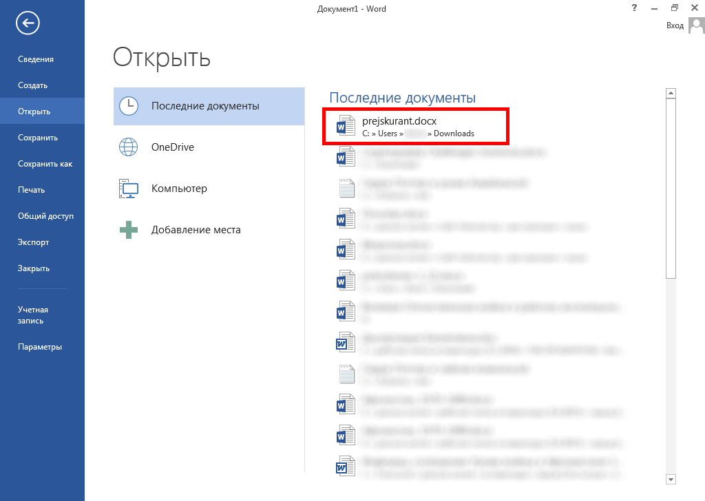 Теперь перезапустим Microsoft Word 2013 и откроем через меню "Файл" список последних документов. Последний файл, с которым мы работали, находится в самом начале. Откроем его.