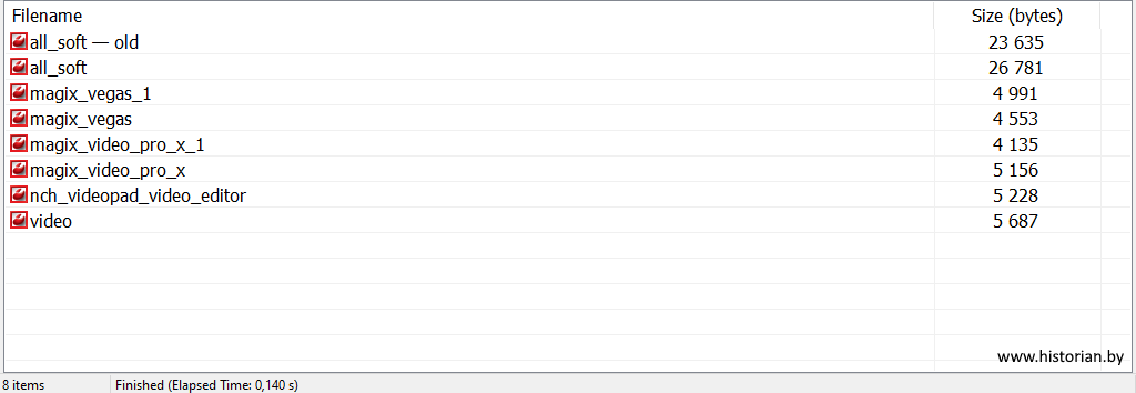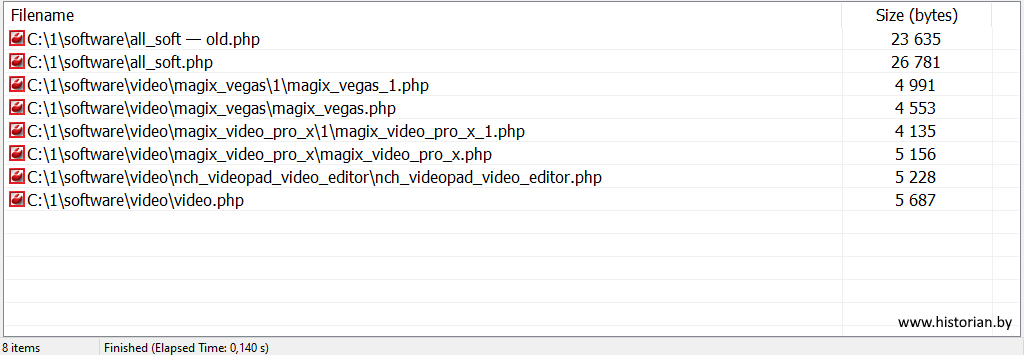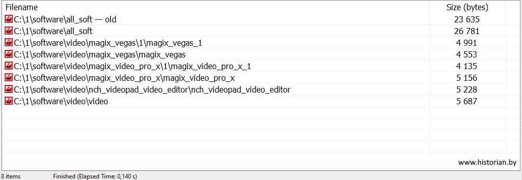По умолчанию сканируются все вложенные папки и вычисляется размер найденных файлов. Дополнительно можно включить показ иконок, скрыть места расположения файлов и спрятать расширения файлов. Три снимка ниже показывают эффект от этих параметров.