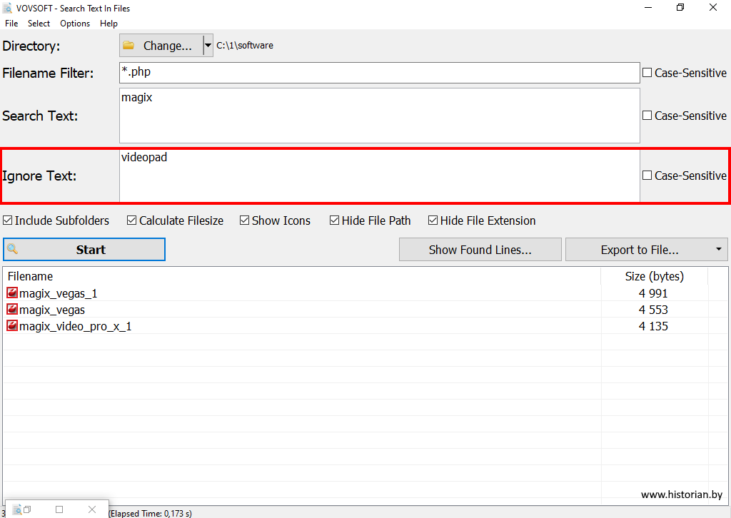 В текстовое поле "Ignore Text" можно ввести стоп-слова. Если в найденных файлах обнаружатся стоп-слова, из поисковых результатов будут исключены строки, содержащие стоп-слова.