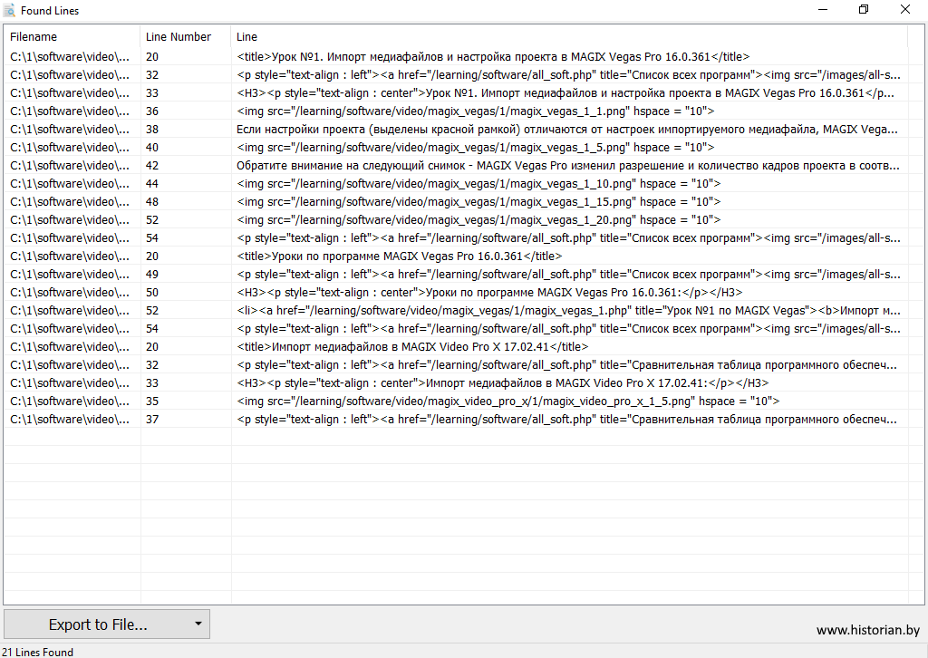 Нажав на кнопку "Show Found Lines", можно просмотреть все найденные строки с поисковым запросом.