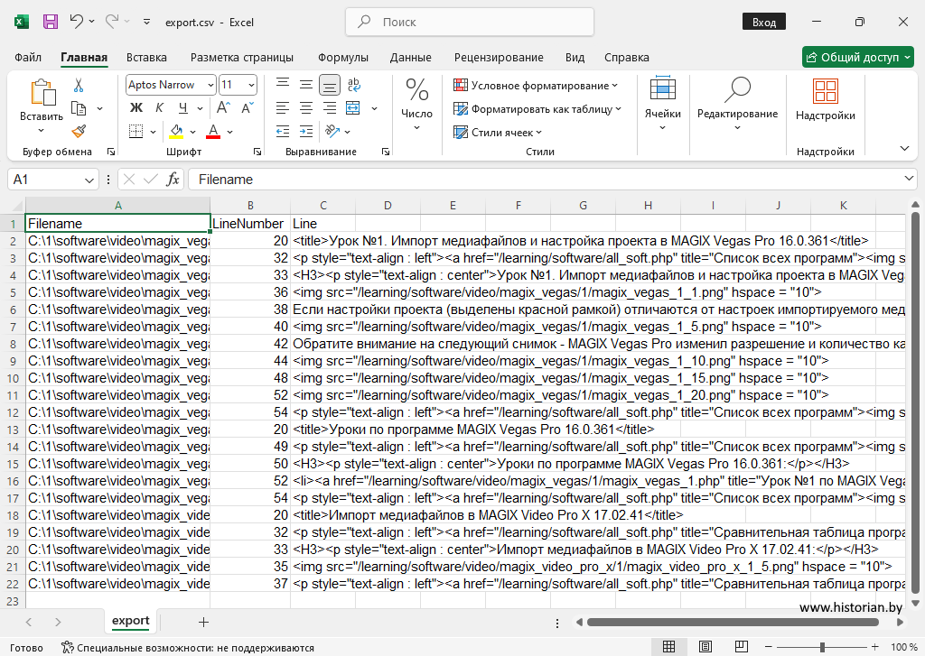 В csv-файле сохраняются место расположения файлов, номера найденных строк и сами строки с результатом.