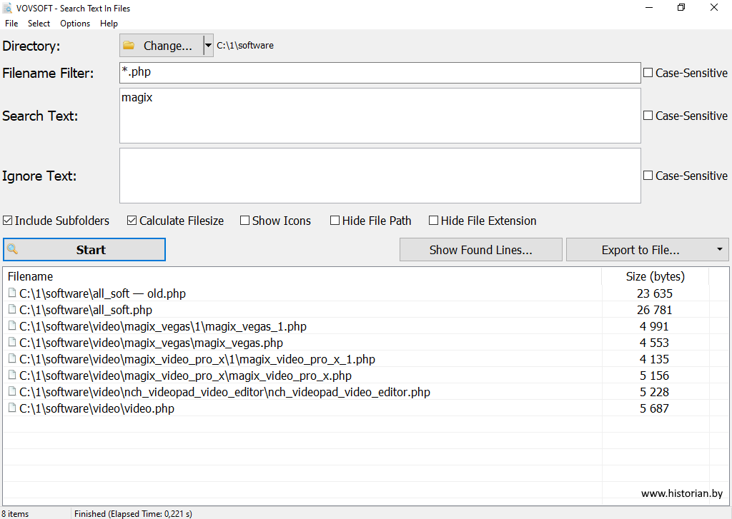 Поиск текста в файлах с помощью Vovsoft Search Text In Files 4.5