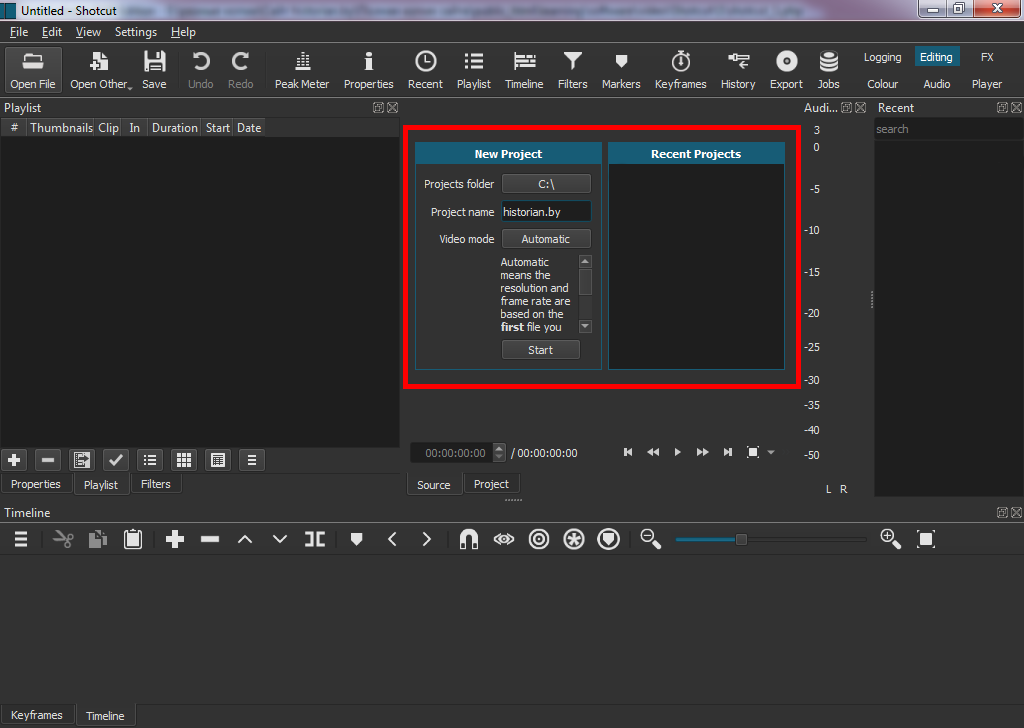 При первоначальном запуске Shotcut 21.12.24 предложит настроить параметры создаваемого проекта. Если вы не знаете точное разрешение видеофайла, которое планируете использовать, выберите параметр "Automatic" для видеорежима (Video Mode"). Для завершения настройки нажмите "Start".