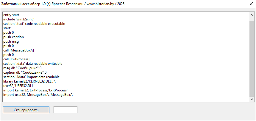 Бесплатная переносная (не требующая установки) программа "Заботливый ассемблер 1.0" создаёт исходный код модального окна на языке ассемблера FASM.
